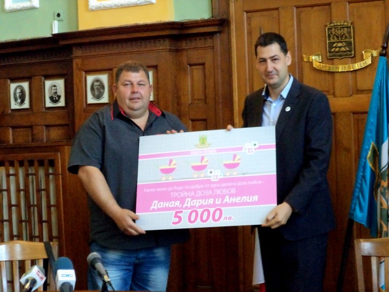 Кметът на Пловдив инж. Иван Тотев връчи чек в размер на 5 хиляди лева на Недялка и Костадин Топорови - родителите на първите тризнаци, родени в града след приемането на нормативните промени за подпомагането на семейства с тризнаци.