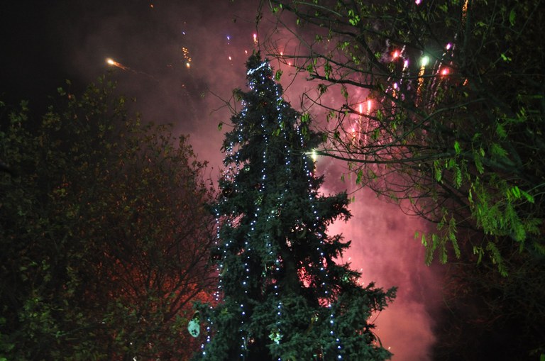 Светлини на Коледната елха в центъра на Пловдив грейнаха, грейна и празничната украса в целия град. Малко след 17.30 часа на 2-ри декември кметът Иван Тотев символично включи осветлението на живата елха в градинката пред общината, а минути след това небето бе озарено от фойерверки.