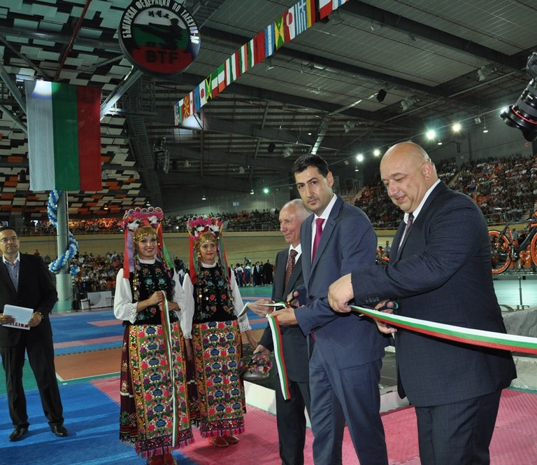 Инж. Иван Тотев, министърът на младежта и спорта Красен Кралев и вицепрезидентът на Европейската федерация по колоездене Александър Гусятников прерязаха лентата.