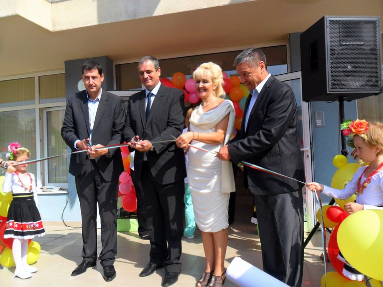 Кметът на Пловдив инж. Иван Тотев, заместник-кметът Петър Зехтински, кметът на район „Източен“ Николай Чунчуков и директорката на ОДЗ „Щастливо детско“ Евгения Попиаванова прерязаха лентата на новоизградения Общностен център.