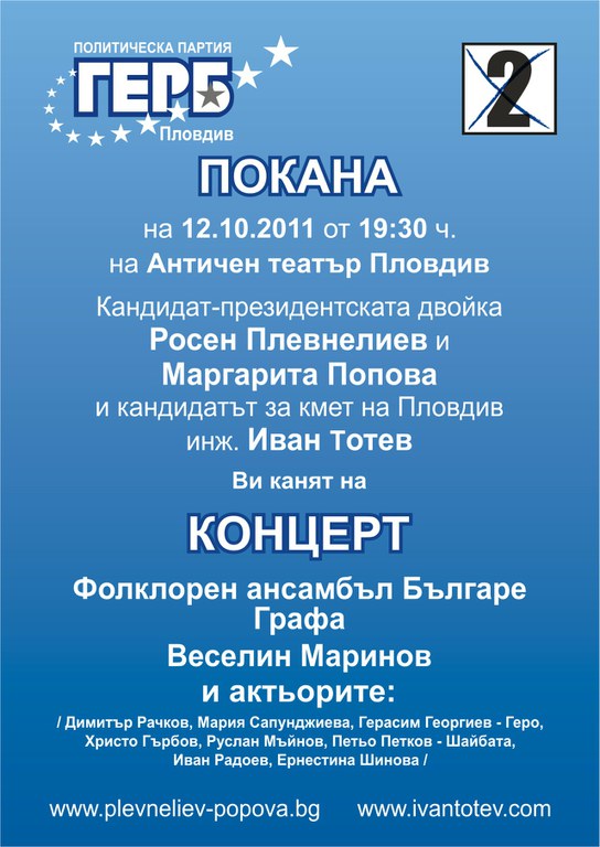 Кандидат – президентската двойка на ПП ГЕРБ Росен Плевнелиев и Маргарита Попова и кандидатът за кмет на Пловдив инж. Иван Тотев канят пловдивчани на голям концерт на Античния театър на 12.10.2011 г. (сряда) от 19.30 часа.