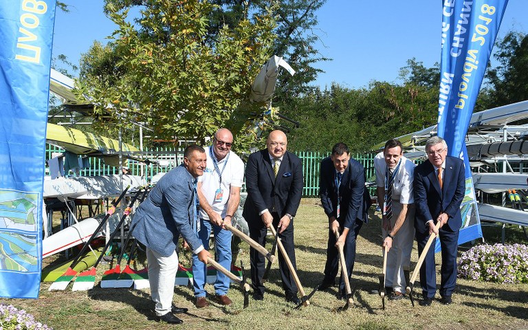 Томас Бах, президентът на международната федерация по гребане Жан-Кристоф Ролан, министърът на спорта Красен Кралев, кметът на Пловдив Иван Тотев, председателят на Българската федерация по гребане Свилен Нейков и председателят на организационния комитет на световното първенство по гребане Иван Попов направиха символичната първа копка на загряващия канал.