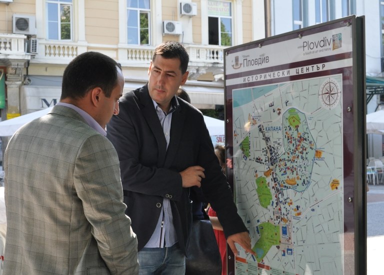 Кметът Иван Тотев и заместник-кметът Стефан Стоянов представиха днес първата от 100-те нови двуезични светещи табла с карти, указващи културните обекти на Пловдив. Тя е монтирана на Главната улица до площад „Стефан Стамболов“.