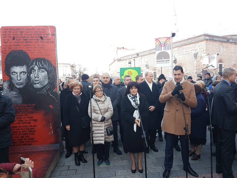 В приветствието си кметът на града Иван Тотев подчерта, че Пловдив е първият град, който отбелязва 30-годишнината от падането на Берлинската стена. Един от 30-те оригинални фрагмента завинаги ще остане в града под тепетата.