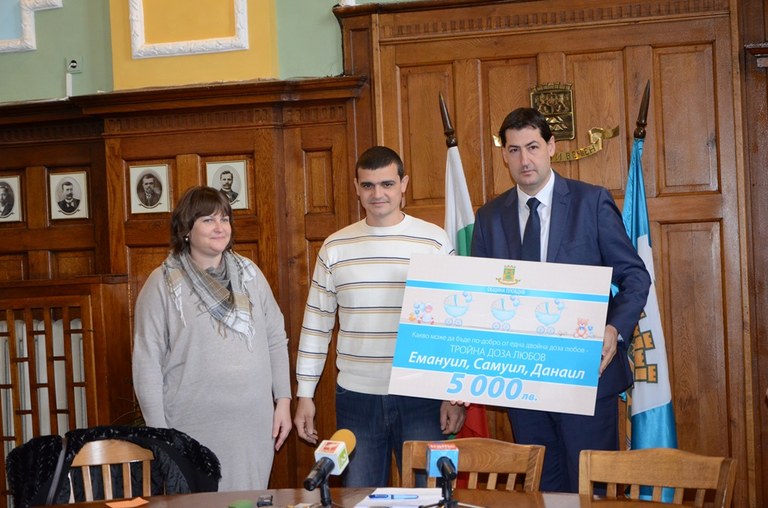 Кметът на Пловдив инж. Иван Тотев връчи чек за 5000 лева на Ивелина и Илия Стоянови, родители на новородените на 5 февруари в града тризнаци Самуил, Данаил и Емануил.