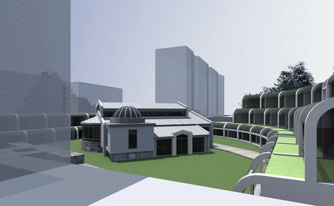 На север от нея се разполага нова нискоетажна застройка с обслужващи функции със стъклени пластични фасади на юг към зелено експозиционно пространство. От югоизток по тротоара на бул. "Мария Луиза" се предвижда подобна павилионна застройка, оформяща двуетажен обем към експозиционното пространство, пешеходно преминаване от тротоара на булеварда на археологическо ниво през отворени, но покрити пространства.